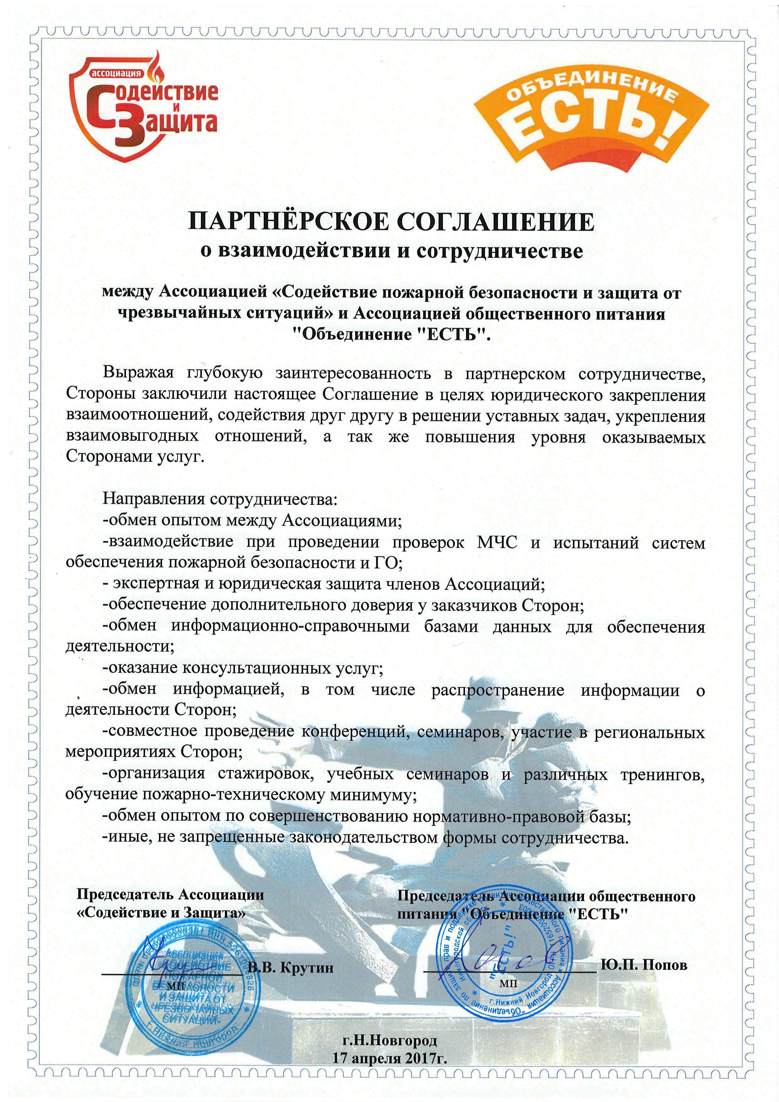 Ассоциацией «Содействие пожарной безопасности и защита от чрезвычайных ситуаций» заключены партнерские соглашения с «Ассоциацией Отельеров Нижегородской Области» и Ассоциацией общественного питания «Объединение ЕСТЬ!»